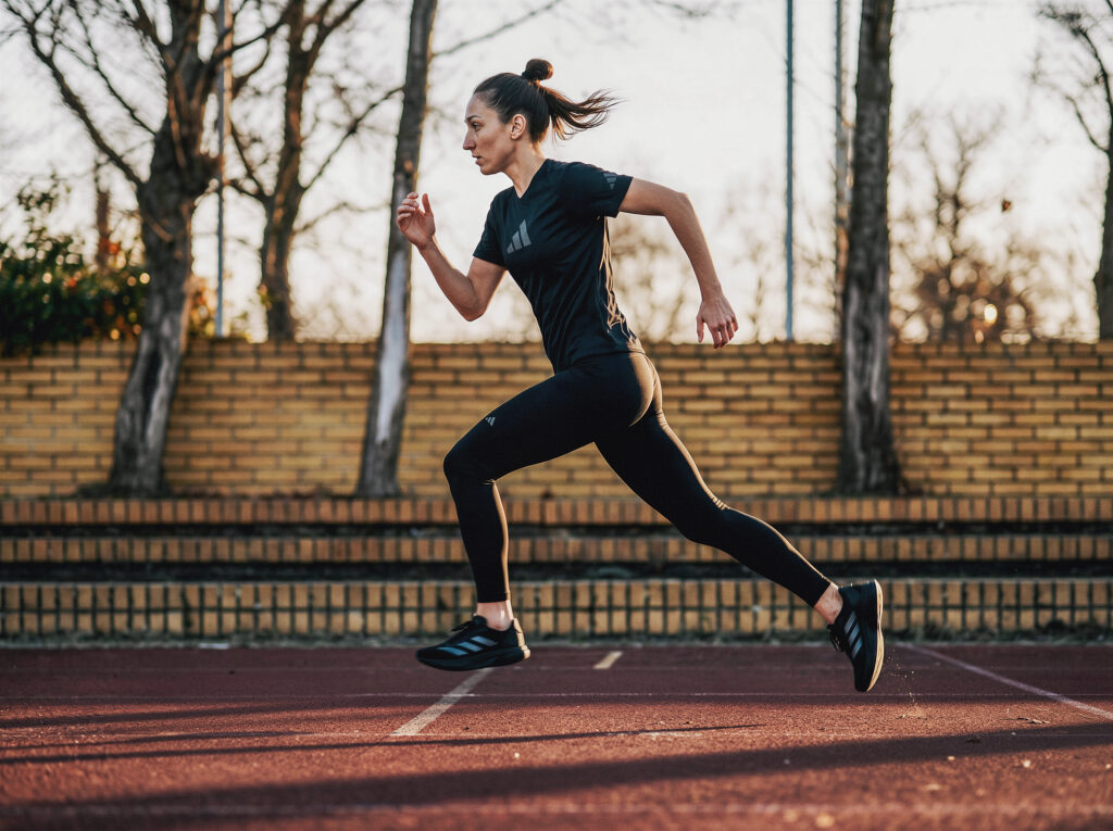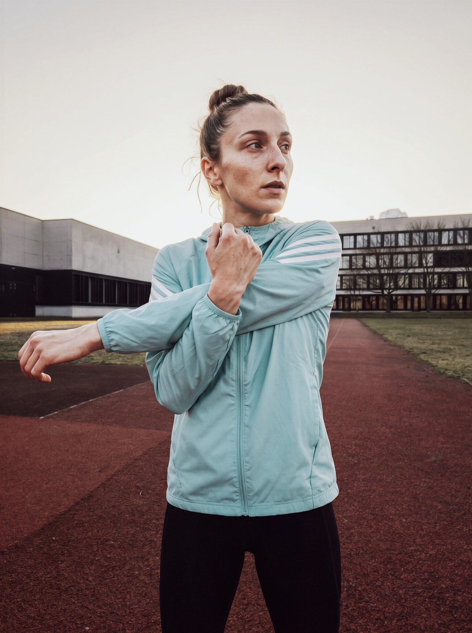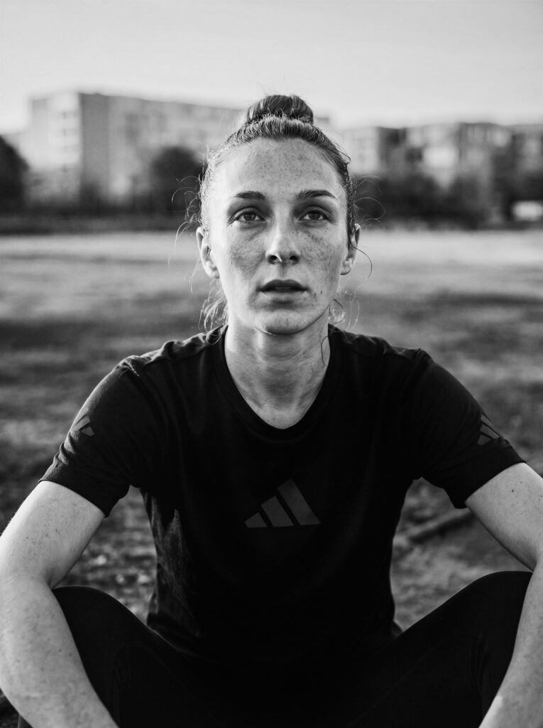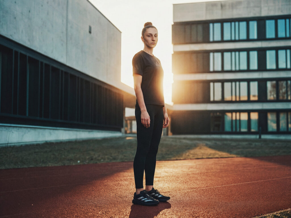 Freie Arbeit: Entwicklung einer Bildstrecke im modernen Sportstyle. Das Modell wurde vollständig generiert und mit real existierender Mode ausgestattet. Das KI-Fotoshooting wurde mit Fotos von einer realen Location kombiniert.